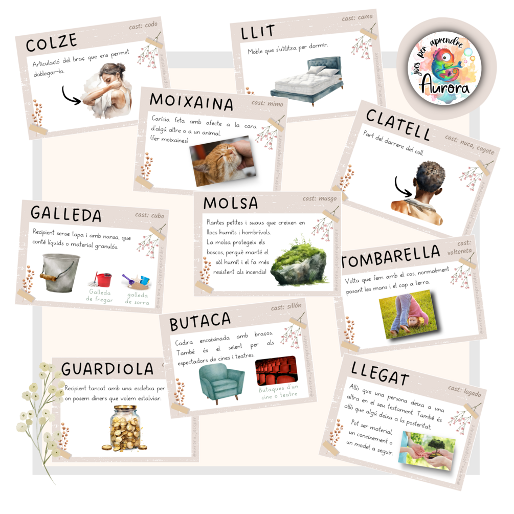 - 60 targetes de vocabulari amb: definició, imatge, traducció al castellà i possibles sentits figurats o expressions.