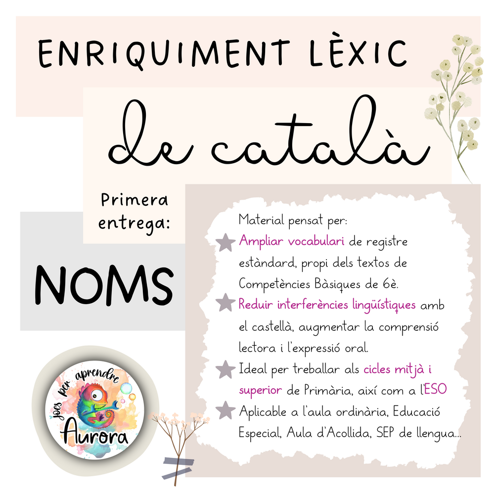 Aquest material està pensat per enriquir el vocabulari de l’alumnat dels cicles mitjà i superior de Primària, així com de l'ESO. Aplicable tant a l'aula ordinària, com en contextos d’educació especial, aula d’acollida, SEP de llengua o grups de reforç.
