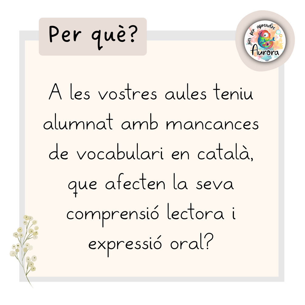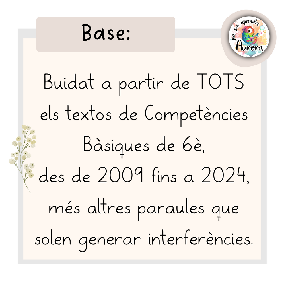 Molts infants i joves no tenen contacte amb el català fora de l’escola, cosa que comporta manca de vocabulari i dificultats de comprensió i expressió. Per donar resposta a aquesta necessitat, aquest recurs ofereix un treball lúdic, sistemàtic i significatiu amb paraules de registre estàndard, especialment seleccionades a partir dels textos de Competències Bàsiques de 6è (de 2009 fins a 2024) i complementades amb altres mots rellevants que sovint generen interferències amb el castellà.