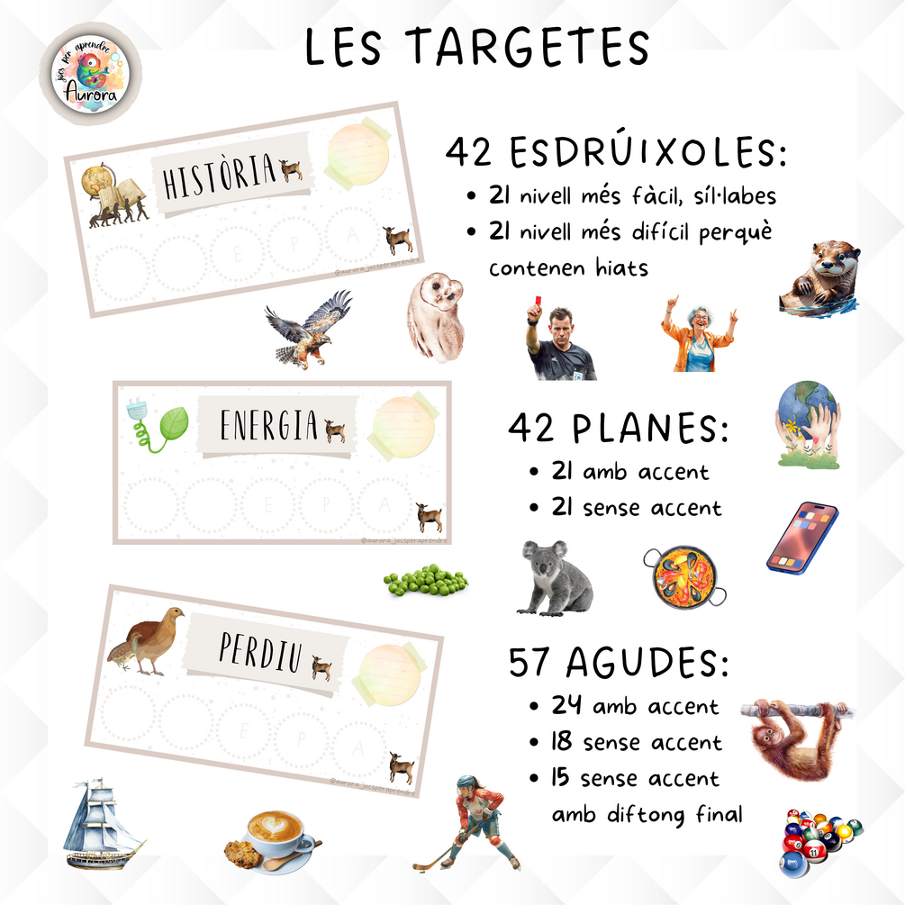 - 141 targetes manipulatives (57 agudes, 42 planes i 42 esdrúixoles)