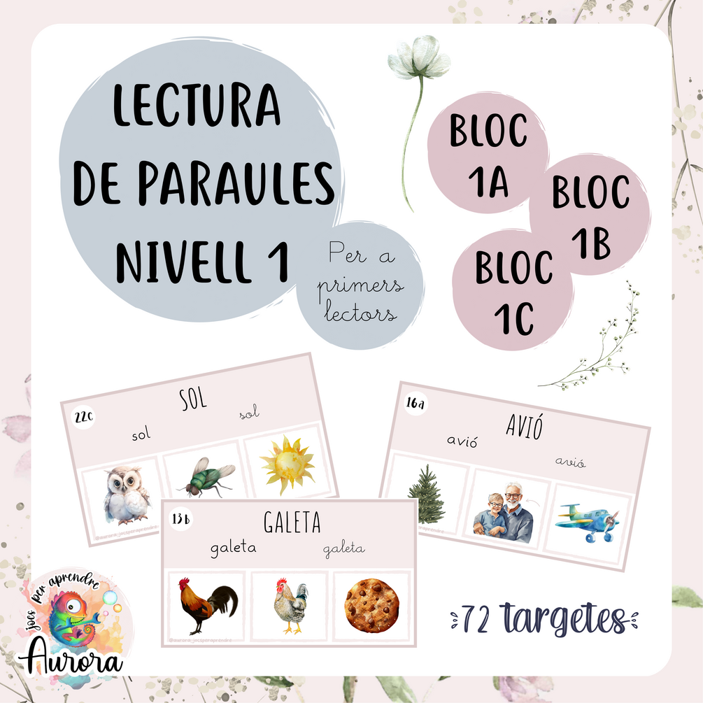 Targetes de lectura comprensiva per a l’inici de la lectoescriptura. En aquest nivell 1: paraules curtes i senzilles, amb opcions similars per afavorir una lectura atenta.