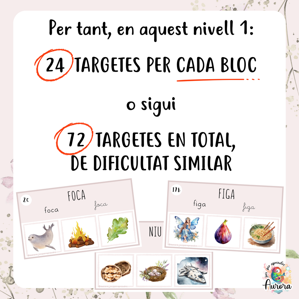 - 72 targetes (repartides en 3 blocs de 24) amb la mateixa dificultat: paraules curtes amb síl·labes directes.