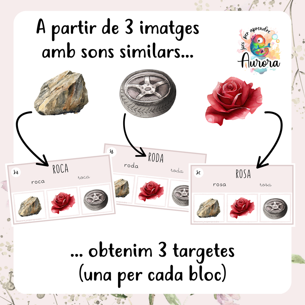Cada targeta mostra una paraula (en majúscula, lletra d’impremta i lletra lligada) i tres imatges, de les quals només una és correcta. Les opcions tenen lletres similars, per tal que l’infant no es fixi només en la inicial i hagi de llegir amb atenció.