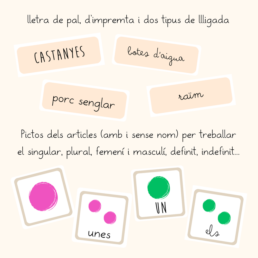 - Pictogrames dels articles, amb i sense el nom escrit, per treballar els conceptes de masculí-femení, singular-plural i definit-indefinit (lletra majúscula, impremta i lligada de 2 tipus).