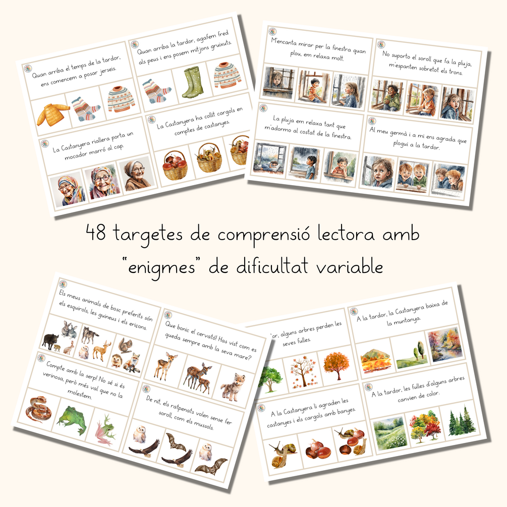 - 48 targetes amb enigmes de dificultat variable i 3 opcions de resposta en imatges, ideals per treballar entonació, inferències i lectura comprensiva (lletra d'impremta, ideal per a cicle mitjà).