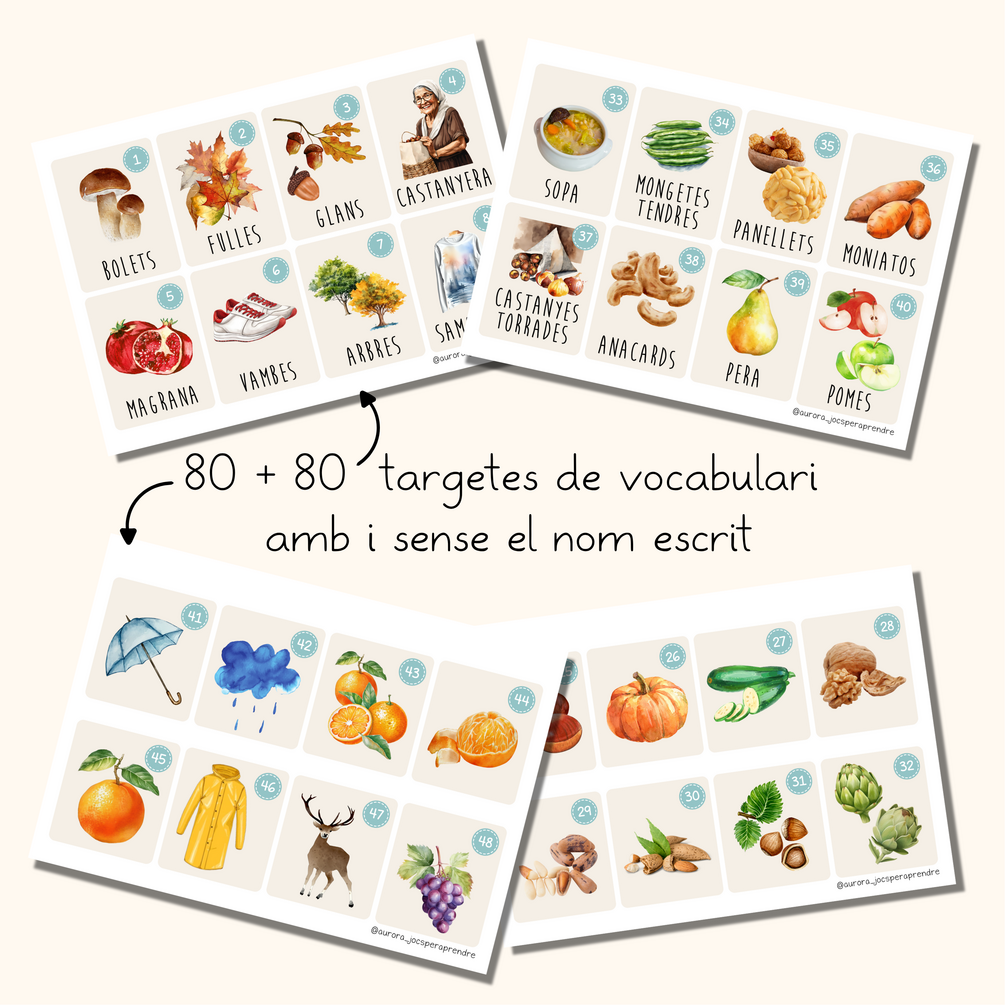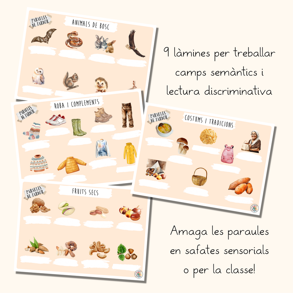 Recurs de llengua amb temàtica de tardor, pensat per a infantil, cicle inicial i mitjà (algunes activitats), així com per a educació especial i alumnat nouvingut. Inclou més de 200 materials visuals i manipulatius per treballar vocabulari, camps semàntics, gènere i nombre, comprensió lectora i escriptura.