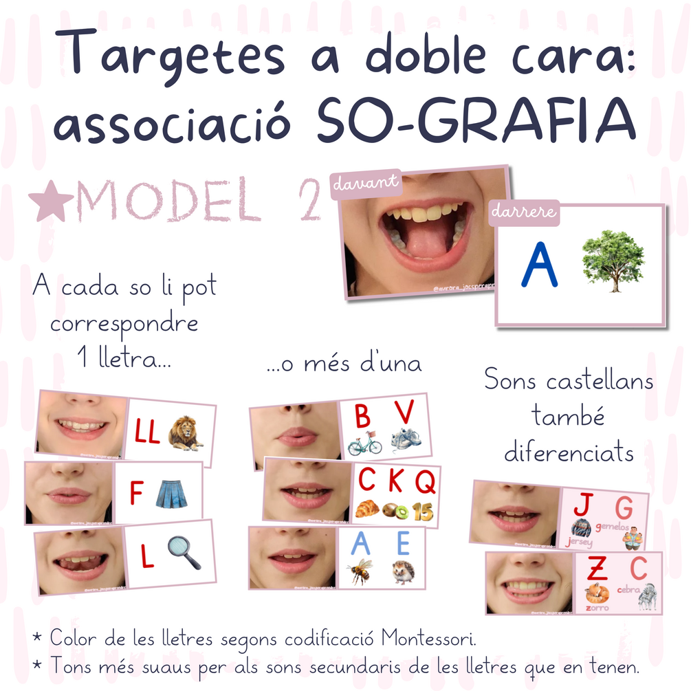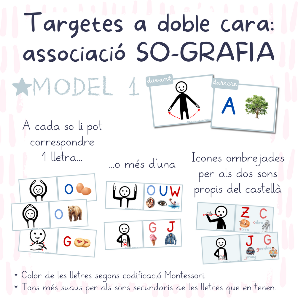• 🎴 Targetes a doble cara per associar so–grafia i grafia–so en tres versions diferents.