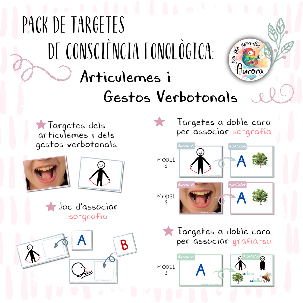 Les TARGETES DE CONSCIÈNCIA FONOLÒGICA: ARTICULEMES I GESTOS VERBOTONALS són un recurs manipulatiu pensat per ajudar els infants a reconèixer, discriminar i associar els sons de la parla amb la seva representació gràfica.