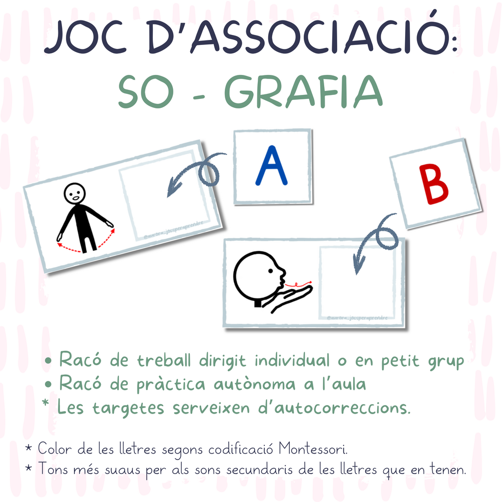 • 🎯 Joc d’associació so–grafia, amb 48 fitxes i 48 lletres per descobrir les relacions entre sons i grafies.