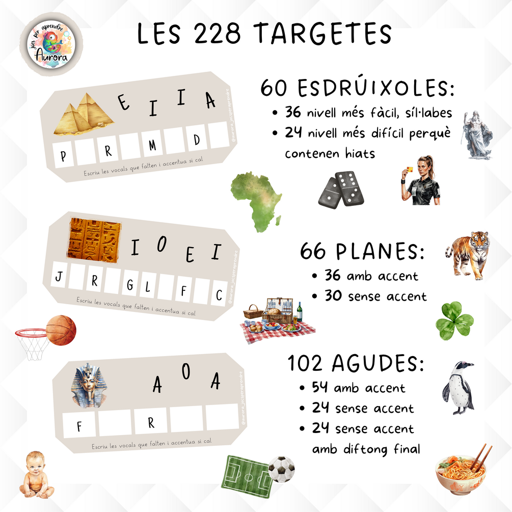 Recurs manipulatiu amb 228 targetes per treballar l’accentuació completant les vocals i accentuant si cal d'una manera lúdica i manipulativa. Inclou plafons, autocorreccions i propostes de joc adaptables al nivell. Ideal per a cicle mitjà, superior i grups de reforç.