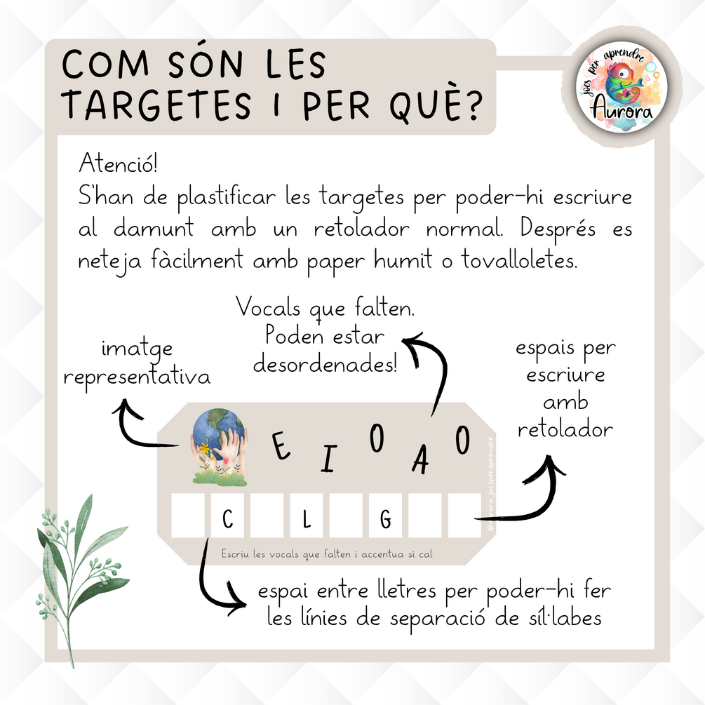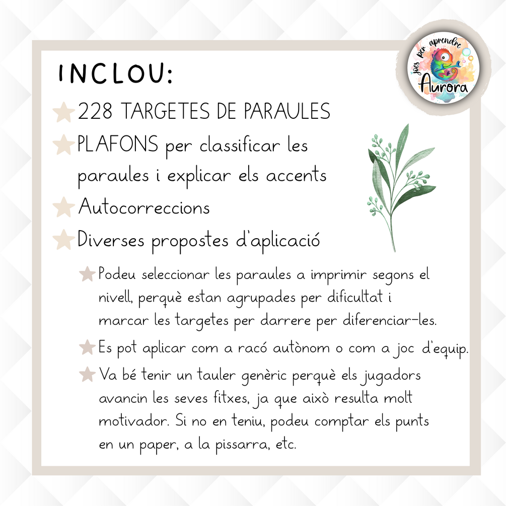 Recurs manipulatiu amb 228 targetes per treballar l’accentuació completant les vocals i accentuant si cal d'una manera lúdica i manipulativa. Inclou plafons, autocorreccions i propostes de joc adaptables al nivell. Ideal per a cicle mitjà, superior i grups de reforç.