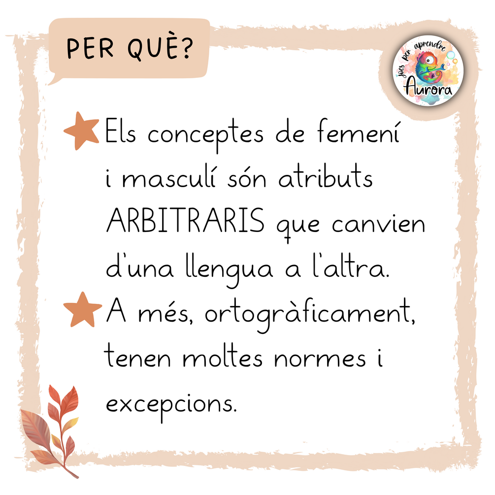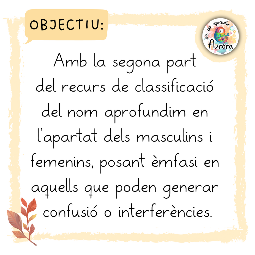 Aquest recurs aporta exemples clars, visuals i senzills per entendre i practicar la formació del masculí i el femení, els casos "especials" i les principals confusions entre català i castellà, amb un format manipulatiu que en facilita la comprensió i ajuda a guanyar seguretat a l’hora d’aplicar la teoria.