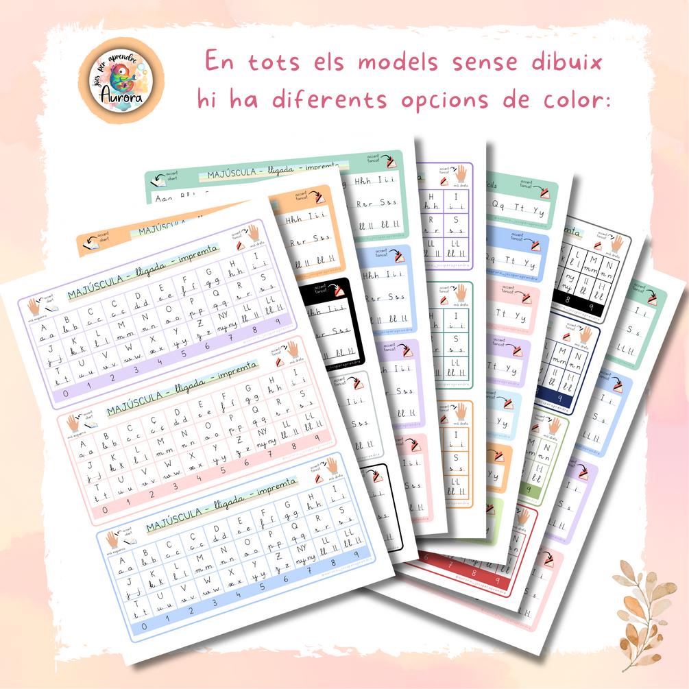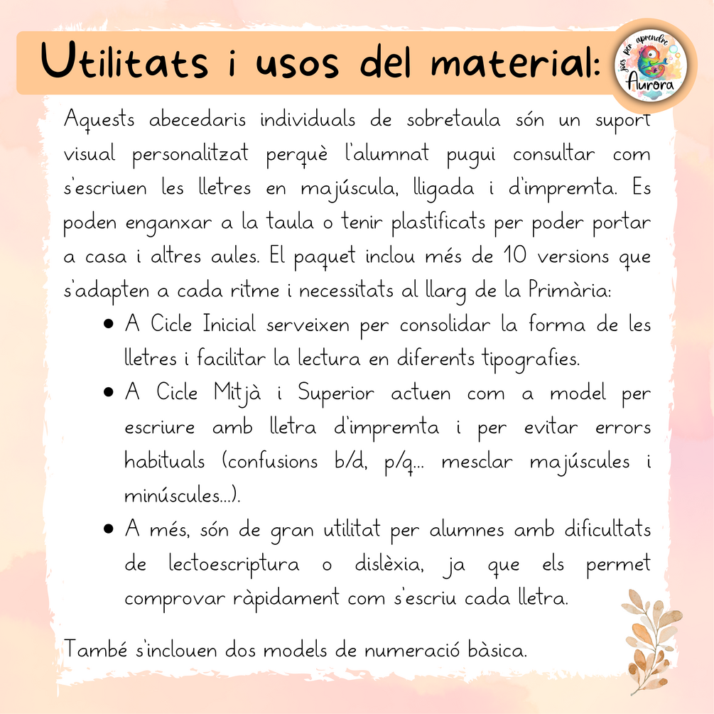 Concretament, aquest material inclou 12 versions diferents d’abecedaris i diverses opcions de color, que s’adapten a les necessitats que van apareixent al llarg de la primària, des de Cicle Inicial fins a Cicle Superior (es poden veure algunes de les versions al carrussel d’imatges).