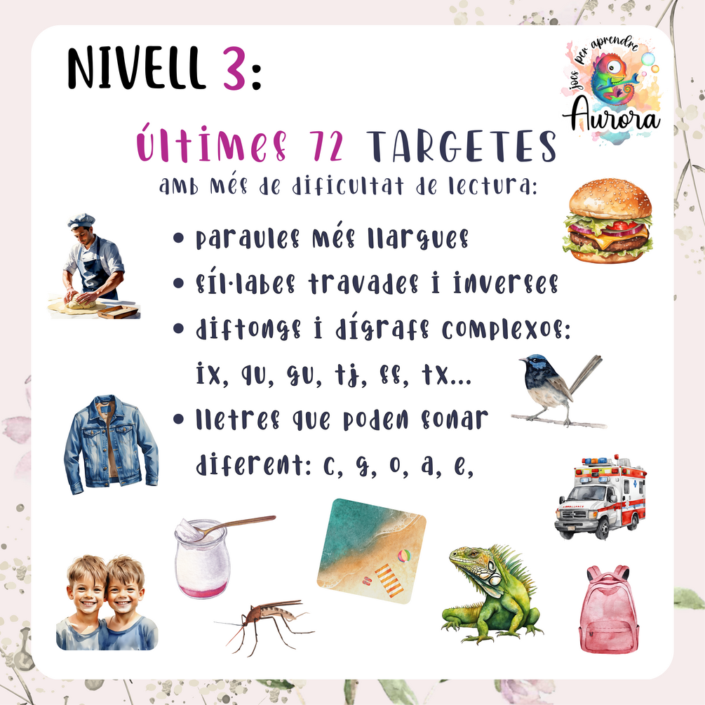 En aquest nivell 3, les paraules són més llargues i complexes, ja que incorporen: