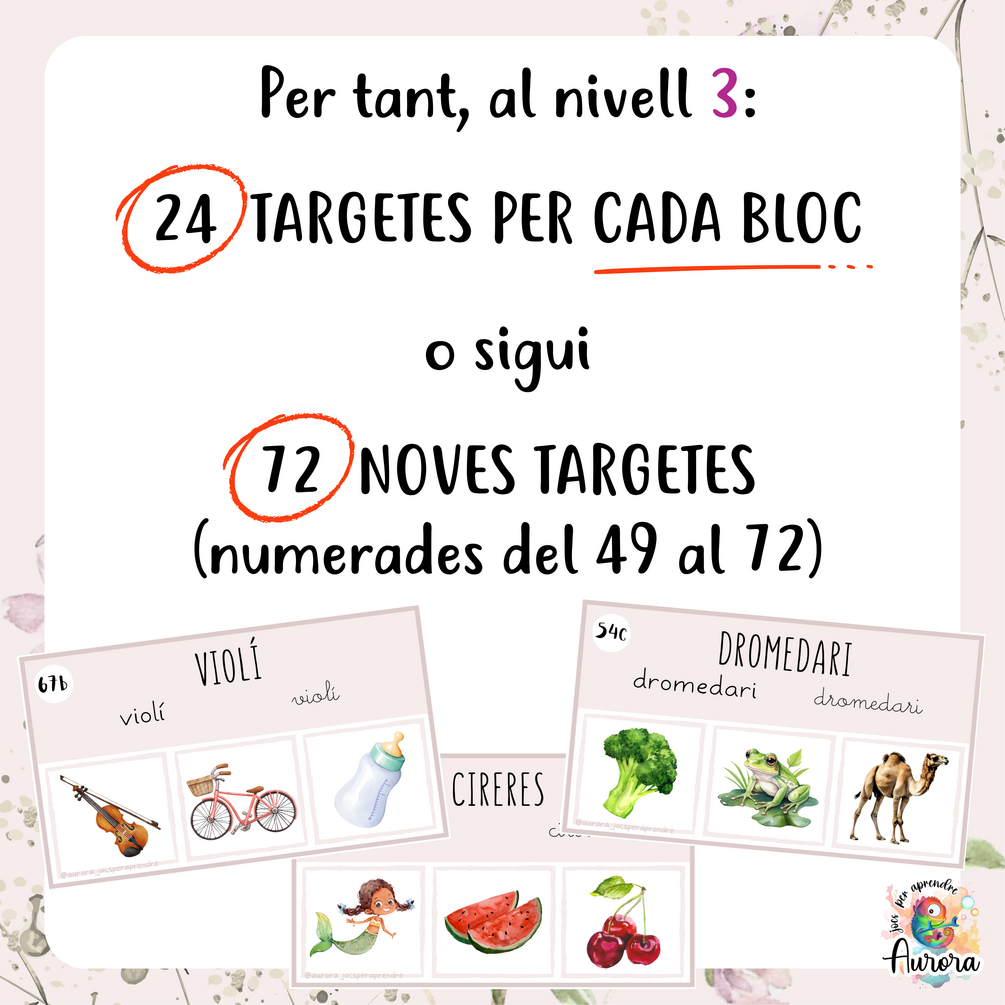 - 72 targetes (3 blocs de 24), amb paraules d’un nivell de dificultat semblant (numerades del 49 al 72).