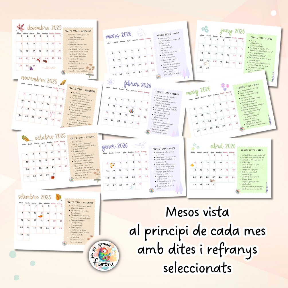 💡 Mesos vista al principi de cada mes, amb molt espai per a anotacions i una selecció de dites i refranys específics de cada moment.