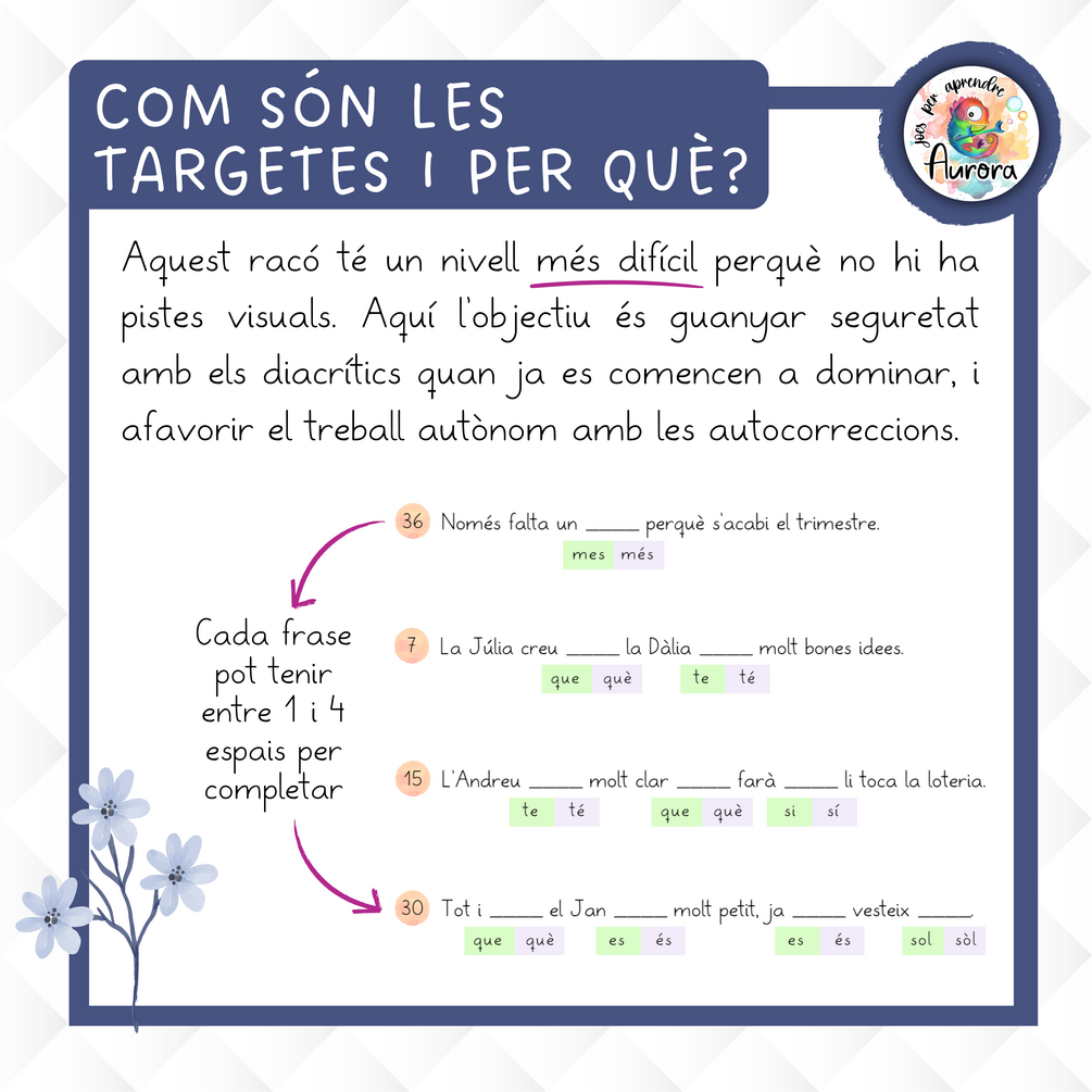 En aquest racó no hi ha pistes visuals. L’alumnat ha de fixar-se en el context de la frase i escollir l’opció correcta de manera més abstracta, com als exercicis d’aula i avaluacions. És una pràctica més exigent que ajuda a: