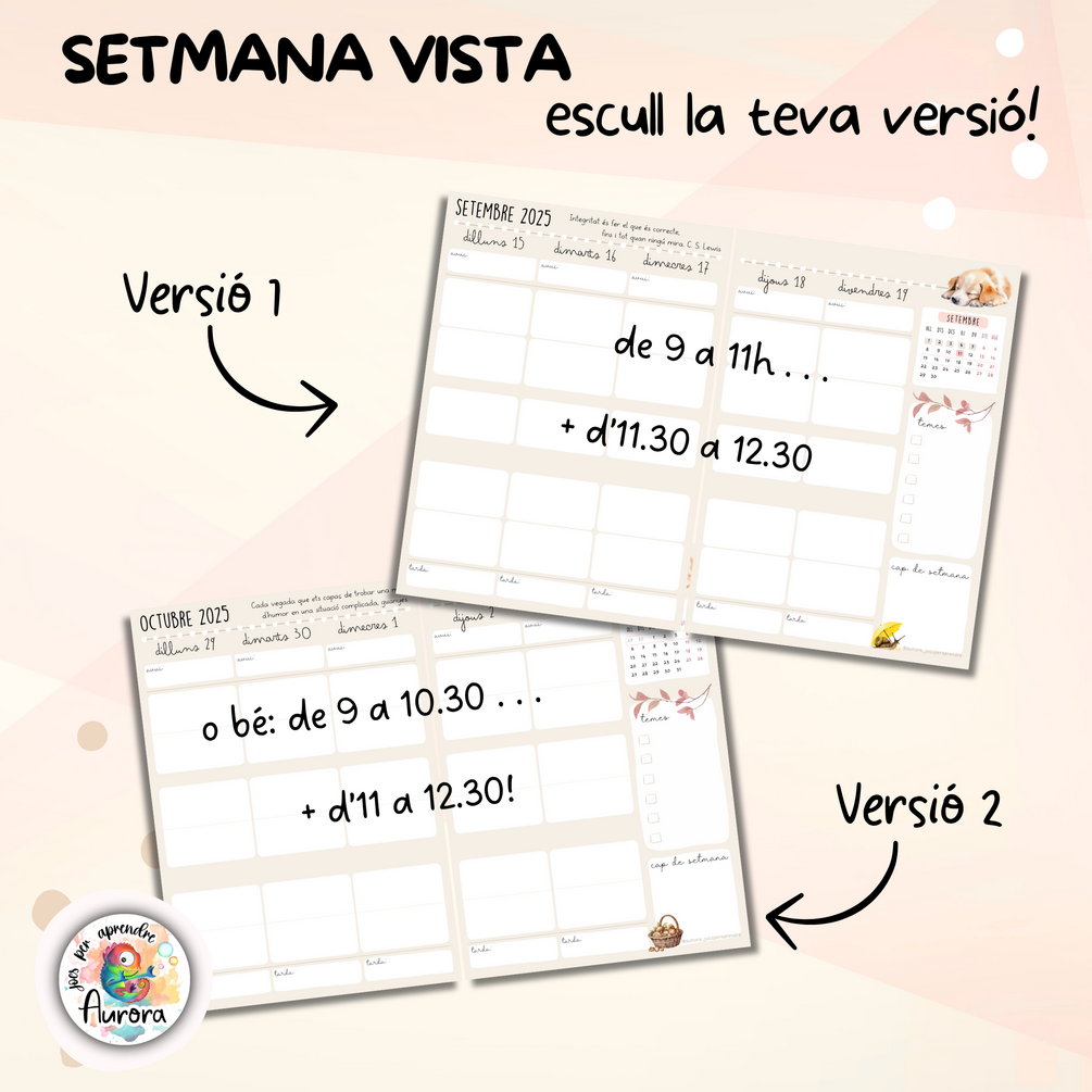 💡 2 models d'agenda setmanal amb diversos espais per anotar coses extres. No hauràs d'escriure el dia ni el mes, ja està tot personalitzat i, a més, també trobaràs el mes en curs en un racó amb l'indicador de la setmana. (Model 1: distribució 9 a 11 + 11.30 a 12.30 + 3 + 4.30. Model 2: distribució 9 a 10.30 + 11 a 12.30 + 3 a 4.30).