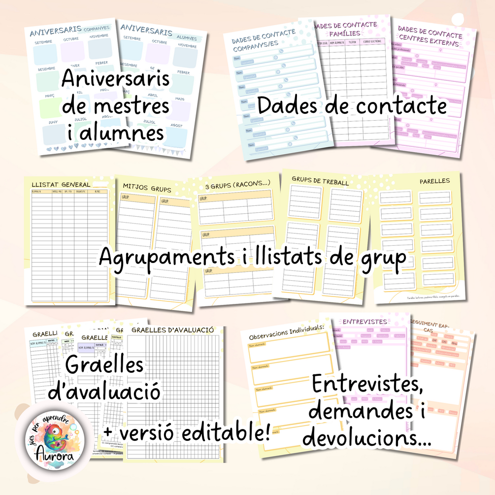 Quadern docent per al curs 2025-26, completament personalitzat, fet amb molt d'amor i cura pel detall, per tenir-ho tot organitzat, accessible i bonic. Inclou: